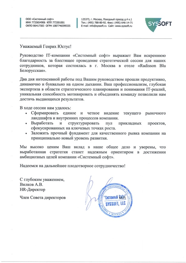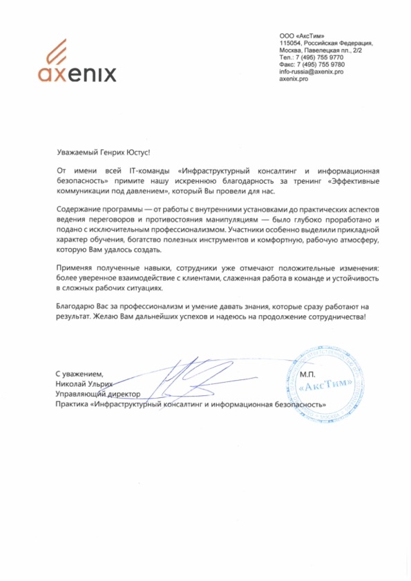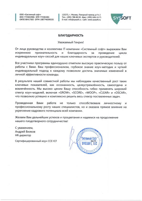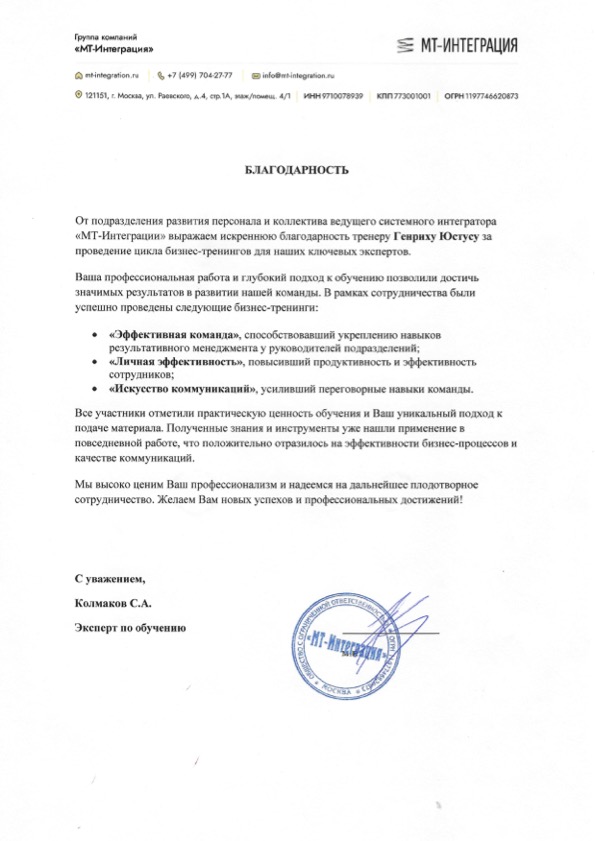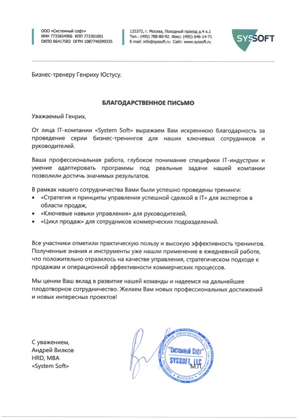 "Самая честная оценка моей работы — это слова заказчиков обучения и результаты их команд. Эти благодарности — не просто приятные отзывы, а свидетельства реальных изменений, которые произошли в компаниях после моих тренингов и сессий. Мне доверяют лидеры рынка. А я благодарен каждому клиенту за открытый диалог и совместную кропотливую работу на положительный результат. Для меня важно не просто провести обучение, а стать надежным партнером в решении прикладных и актуальных задач"