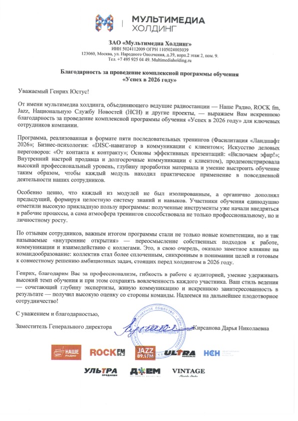 "Самая честная оценка моей работы — это слова заказчиков обучения и результаты их команд. Эти благодарности — не просто приятные отзывы, а свидетельства реальных изменений, которые произошли в компаниях после моих тренингов и сессий. Мне доверяют лидеры рынка. А я благодарен каждому клиенту за открытый диалог и совместную кропотливую работу на положительный результат. Для меня важно не просто провести обучение, а стать надежным партнером в решении прикладных и актуальных задач"